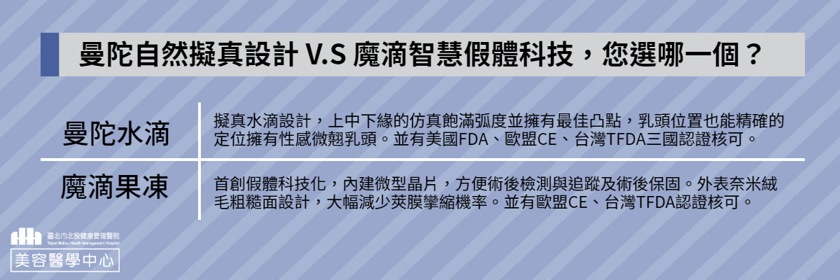 北投健康管理醫院美容醫學中心黃志宏副院長表示目前最主要使用的隆乳植入物主要是以矽膠果凍為主作為填充物,而其中又以曼陀水滴型果凍矽膠及波力媚圓盤型果凍矽膠(魔滴)為最多醫美門診諮詢者關切最多的兩種材質。