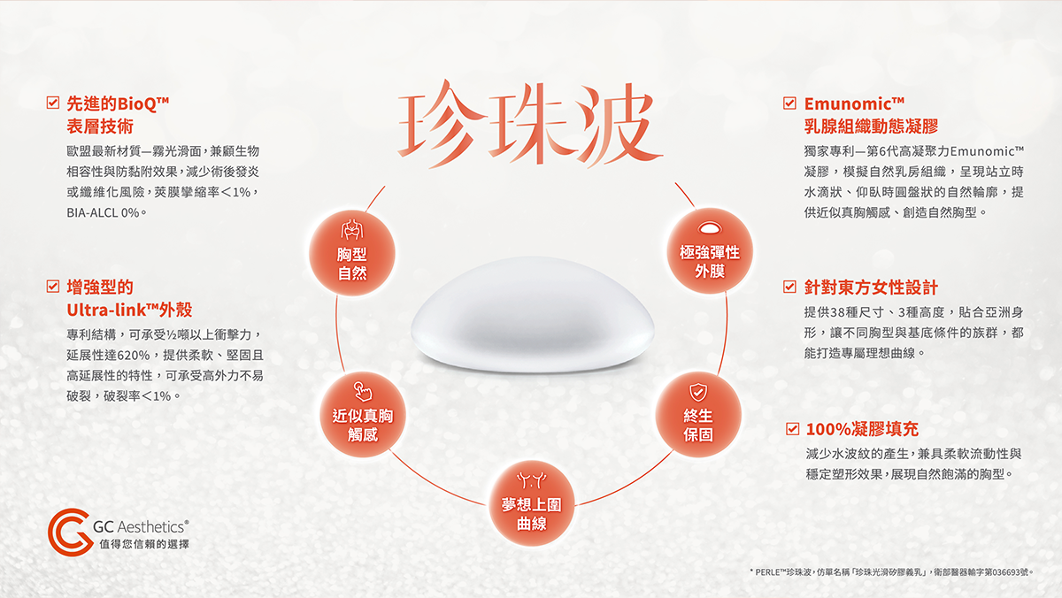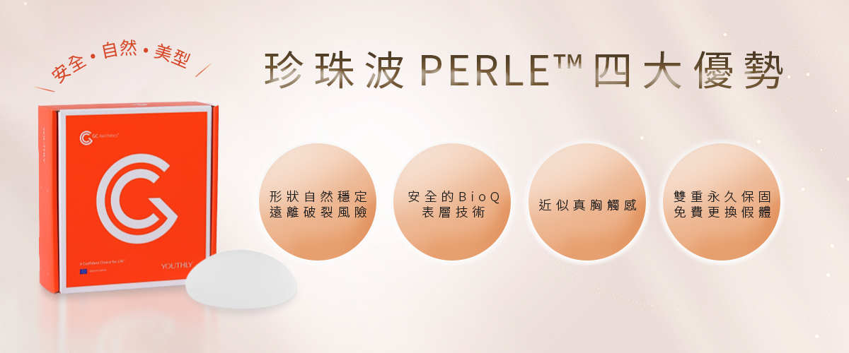 珍珠波 PERLE™是由GC Aesthetics®生產的植入假體。由英國 GC Aesthetics® 出品,具有40年歷史的知名品牌,專注於美容和重建手術產品,GC Aesthetics®全球300萬植入物的臨床驗證,已在全球70個國家與地區銷售超過300萬個,並且這些產品的長期臨床數據驗證了安全性和臨床有效性!